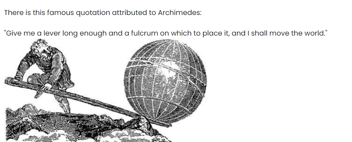 Give me a lever long enough and a fulcrum on which to place it and I shall move the world. Give me a lever long enough and a fulcrum on which to place it and I shall move the world Archimedes. Greek - Mathematician 287 BC - 212 BC.