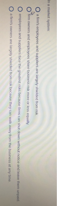 B are usually shielded from risk and share in the profits of the firm. In a market system employees and suppliers aare usually shielded from risk and share in the profits of the firm. Are generally subject to as much risk as firm owners but get to share in. Are usually shielded from risk but at the cost of not sharing in the profits of the firm. Firm owners and employees share business risk more or less equally. A firms employees and suppliers are largely shielded from risk. Get the detailed answer. Are generally subject to as. In a market system employees and suppliers.
