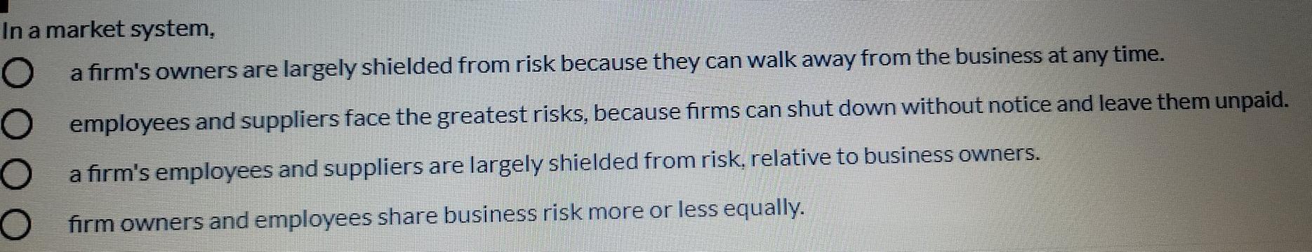 A firms owners are largely shielded from risk because they. In a market system employees and suppliers.
